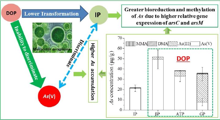 当前涉及溶解有机磷(DOP)对生物体中砷酸盐(As(V))生物积累和生物转化的影响研究相对较少,不利于砷地球化学循环的全面理解和调控。为此,颜昌宙研究组罗专溪副研究员与闽南师范大学王振红副教授、美国麻省大学阿默斯特分校邢宝山教授等开展合作研究,选取了三种不同的有机磷源(β甘油磷酸钠(βP)、三磷酸腺苷(ATP)和葡萄糖磷酸钠 (GP))与无机正磷酸盐(IP)相比较,探讨不同磷源下铜绿微囊藻对As(V)的毒性效应、累积与生物转化的差异,并试图在亚细胞分布水平和基因表达方面进行科学解释。研究结果发现:铜绿微囊藻在IP环境下对As(V)耐受性更高,这与该条件下藻体磷(P)在金属敏感组分(MSF)中的较高分布相一致。DOP环境下铜绿微囊藻中砷在MSF组分中分布较高,可较好解释该环境下砷的较高毒性与敏感性。同时发现IP环境下铜绿微囊藻对As(V)和P有较好识别,但在DOP环境则没有观察到这种识别。DOP环境特别是βP时可显著提高藻体对砷的累积;而GP则明显促进了砷的还原与甲基化,这得到了GP环境下藻体砷还原与甲基化功能基因(arsC和arsM)相对表达量较高的良好印证。研究结果为科学深入地了解环境中DOP如何调控微藻砷转化提供了新思路。