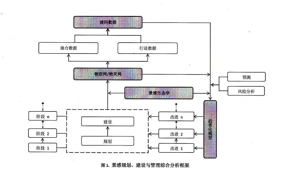 综合上述关于景感生态学、趋善化模型、谜码数据、物联网的分析,可以得到景感规划、建设与管理的综合分析框架(图1)。