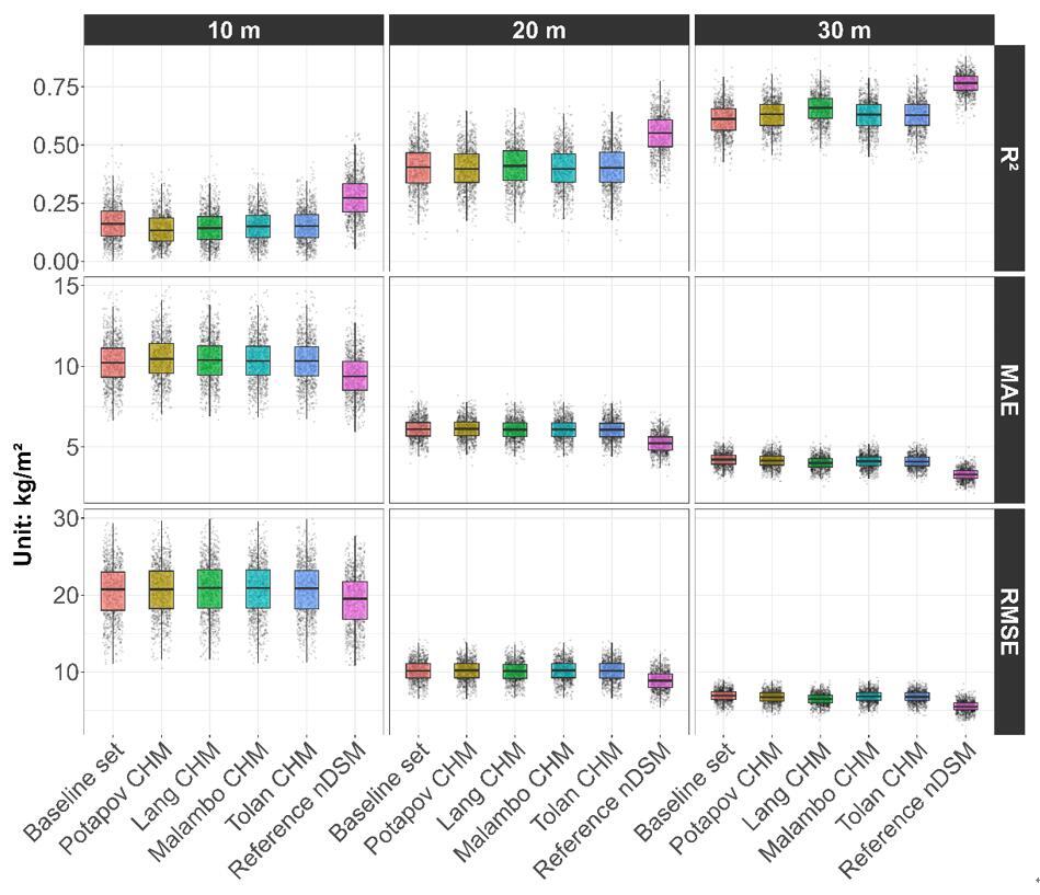 注:该图对比了在不同空间尺度下,引入不同树冠高度数据后城市树木碳密度反演模型的预测效果。结果显示,只有高精度机载LiDAR数据能够显著提升模型精度,而多种大尺度、开源树冠高度产品与不使用树冠高度数据的基线模型表现接近,未带来稳定的预测改进。这表明,在复杂城市环境中,大尺度树冠高度产品难以为碳储量估算提供实质性的新增信息。