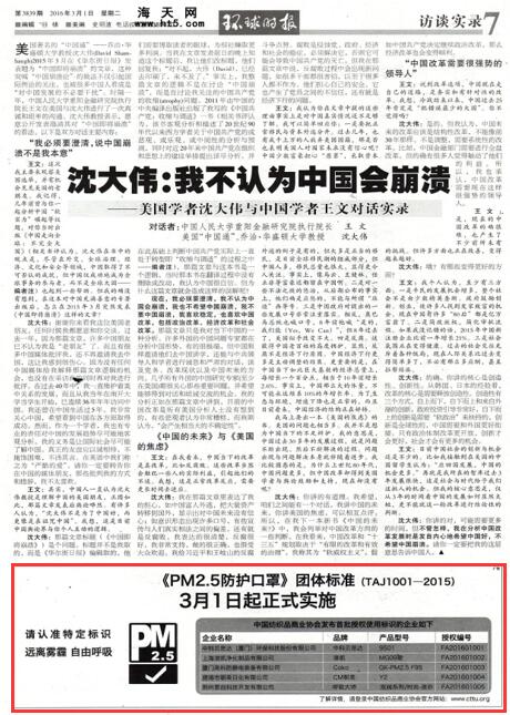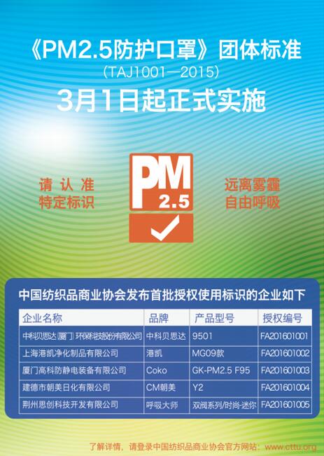 3月1日起,由中科院城市环境研究所作为第一起草单位牵头编制、我国第一个向社会发布的《PM2.5防护口罩》团体标准(TAJ1001-2015)正式实施。环球时报、京华时报、东方早报等各大报刊纷纷对该标准的实施进行了报道。今后,消费者只需认准授权企业和PM2.5口罩特定标识即可购买到可靠有效的防雾霾口罩,口罩生产企业将有具体的民用口罩生产标准执行,质检机构也将可根据民用口罩标准抽检执行团体标准的PM2.5防护口罩。