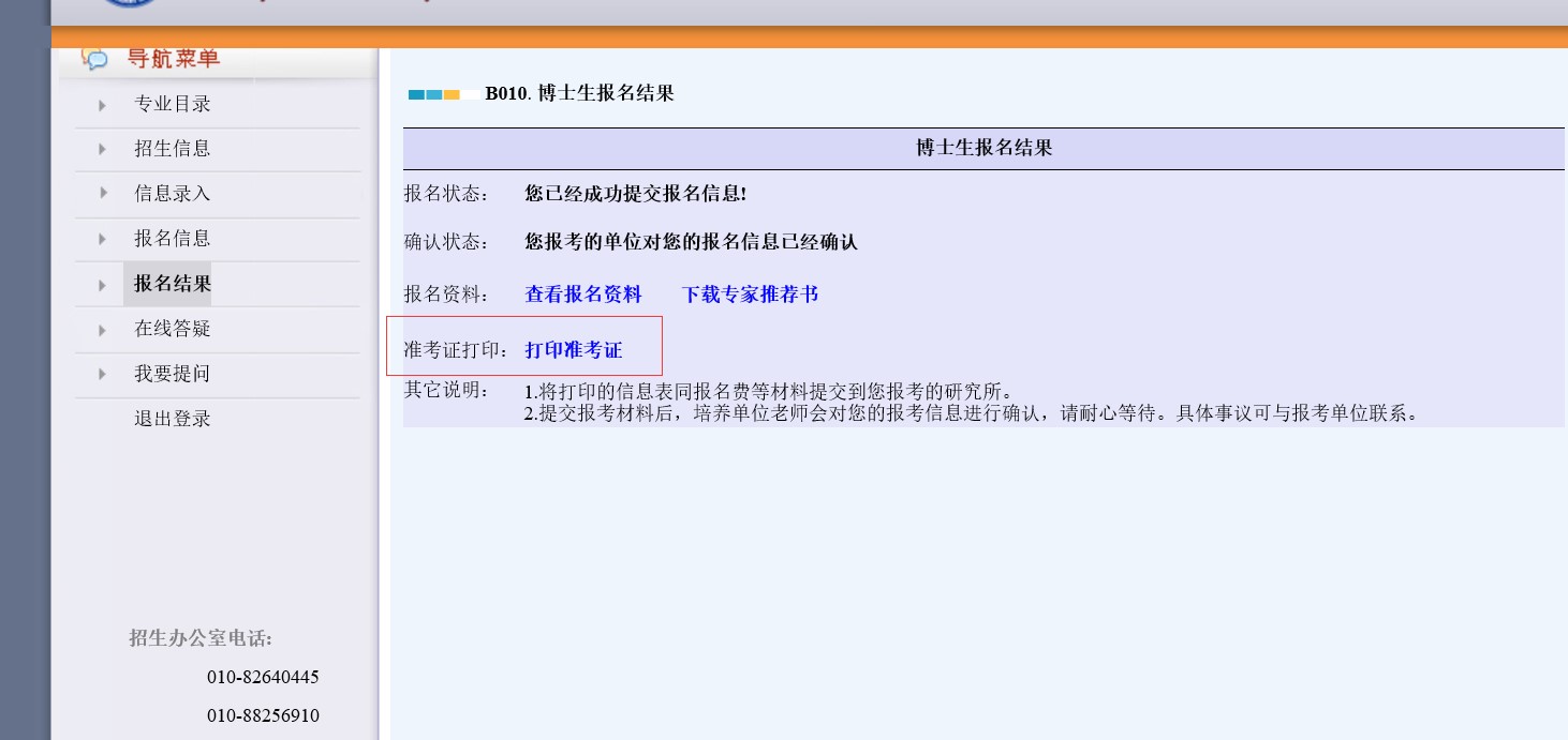 (三)准考证打印315日后,考生可登陆中国科学院大学博士网报系统,在“报名结果——准考证打印”页面中,在线打印准考证,建议先下载保存再打印,打印时请使用A4纸横向打印,彩色、黑白打印均可。打印网页截图如下: