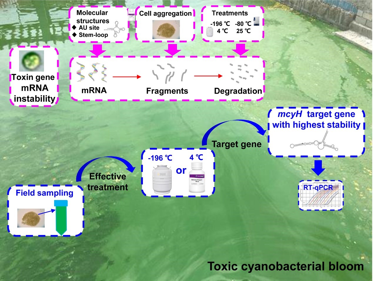 针对这个问题,中国科学院城市环境研究所饮用水生物安全研究小组建立了不同处理条件下(-80 ℃, -196 ℃, 4 ℃ or 25 ℃ with RNases inhibitors)藻毒素基因 (mcyA-J)转录本的降解动力学,并进一步研究了藻毒素基因 (mcyA-J)转录本的分子结构。实验结果充分揭示了以微囊藻毒素基因为代表的藻毒素基因转录本的高度不稳定性,其稳定性主要受到藻细胞聚集以及转录本分子二级结构(AU位点和茎环)的影响。在藻毒素基因簇中(mcyA-J),mcyH的转录本稳定性最高,因为其分子具有最少的AU位点和茎环结构,是监测有毒蓝藻水华最合适的靶基因。另外-196 ℃是稳定这些毒素基因转录的最有效的处理方法,而RNAstoreR (4℃)可以在短时间内(1-7 d)有效稳定这些毒素基因转录。然而,细胞聚集降低了这些转录的稳定性,尤其是RNAstoreR处理。因此,水资源管理者和生态学家在有毒蓝藻水华现场分子监测中需要更多地关注这些蓝藻团聚体,针对自然水体中的藻细胞团聚体可能需要现场采样并快速分析,或者使用有效的处理方法来稳定藻毒素基因的转录本。藻毒素基因转录本的稳定性问题一直被以前的分子监测研究所忽视,而本研究为有毒蓝藻及其代谢产物蓝藻毒素的分子监测提供了重要参考。