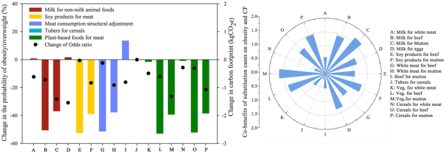 Dietary adjustment through food group substitutions is an adaptive strategy for obesity management in human populations and action on climate change. However, specific dietary adjustment scenarios (DASs) are underexplored in the current research. This study applied logistic regression to establish an association between the probability of obesity/overweight (O/O) and eleven food groups. The findings suggest that consumption of greater amounts of vegetables (odds ratios (OR) = 0.964) and milk (OR = 0.946) is associated with a less likelihood of O/O, while greater amounts of eggs (OR = 1.367), white meat (OR = 1.078), cereal (OR = 1.037), beef (OR = 1.105), and mutton (OR = 1.317) is associated with a greater likelihood of O/O. With a 100 g replacement, the scenario of substituting milk for eggs is related to a 31% reduction in the probability of O/O (PO); substituting vegetables for beef would produce a 2.65 kg CO2e reduction in individual CF per year; substituting milk for mutton is related to the highest co-benefits with PO and CF reduced by 28% and 1.85 kg CO2e per year, respectively. Moreover, making a 50 g replacement, the scenario of substitution of red meat with milk, soy products, and white meat produces a 9.1 Mt, 6.5 Mt, and 3.4 Mt CO2e annual CF reduction in China under an assumption that half of the population adopt the dietary substitution twice a week. Similarly, the scenario of substituting cereals with tubers would cut the national CF by 0.3 Mt CO2e per year. On nutritional effects, almost DASs produce slight disturbance on protein, fat, and calorie and the change ratio is within 5%. Dietary adjustment measures focus on increasing plant-based food consumption, re-orienting the mix of meat products consumption (via substituting red meat with white meat and introducing meat alternatives, especially soy products), publicizing the benefits of dietary adjustment to consumers, and emphasizing the changes in nutrition, especially in situations of substitution of animal-based foods with plant-based foods, but the influence on protein and fat deserves attention.