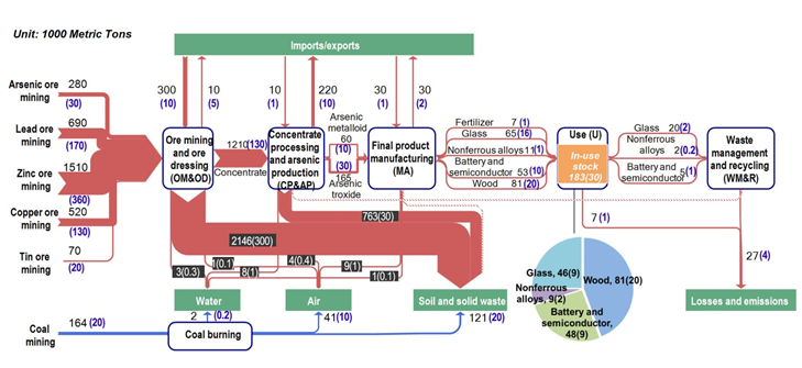 砷(Arsenic, As)是一种具有毒性的类金属元素。当前由于人类活动引起的砷流通量已经超过人类圈砷流通量的50%,导致相应的环境与健康问题的加剧。中国既是全球最重要的砷生产和消费国,也是砷污染最为严重的国家之一。尽管如此,当前对由于人为活动引起的砷在全球环境中的循环还缺乏比较系统的研究。