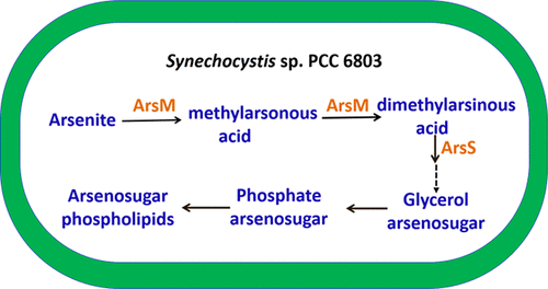 中国科学院城市环境研究所城市朱永官研究组与奥地利格拉茨大学的Kevin Francesconi教授合作基于模式生物蓝藻Synechocystis sp. PCC 6803能将毒性较强的三价砷转化成砷糖和砷糖磷脂的研究。首先将ars操纵子上三个可能参与砷糖合成的基因(slr0303, slr0304, slr0305)敲除,用不同形态砷处理突变体,高效液相色谱-电感耦合等离子体质谱法(HPLC-ICP-MS)分析细胞及培养基中砷形态变化,发现三价砷处理的slr0303和slr0304突变体不能合成砷糖;进一步在大肠杆菌中异位表达slr0303和/或slr0304,利用HPLC-ICP-MS/电喷雾串联质谱 (ESI-MS-MS)和高效液相色谱-高效电喷雾质谱(HPLC-ESI-HR-MS-MS)技术分析三价砷处理的大肠杆菌细胞及培养基中砷转化,结果表明共同表达slr0303和slr0304的大肠杆菌将无机的三价砷转化成DMA和多种含羟基羧酸的二甲基砷。