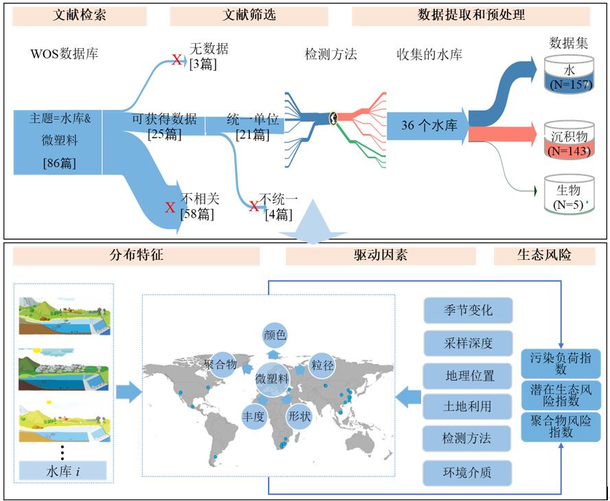 水库是一类容易受人类活动影响并反作用于人类健康的生态系统,是以水为纽带认知环境微塑料影响下一体化健康的“天然实验室”。鉴于此,中国科学院城市环境研究所联合牛津大学、宾夕法尼亚州立大学、新墨西哥州立大学等单位研究人员以水库生态系统为案例跨学科合作构建了第一层面的环境微塑料数据一体化路径(图1)。该路径仍采用研究人员在早前研究工作中提出的“提取-分流-统计”的总体思路,但在每个环节中针对水库微塑料科学数据结构特点进行了相应的更新。这一更新的具体环节和应用分析结果以Global meta-analysis of microplastic contamination in reservoirs with a novel framework为题发表在《Water Research》。