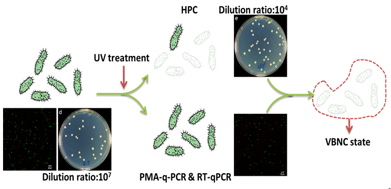 培养法是水厂检测各种微生物指标最为广泛的方法,而细菌有活性但不可培养(viable but nonculturable, VBNC)状态的存在势必会使这一方法低估水中细菌,包括病原菌的水平,对饮用水的生物安全性造成极大威胁。紫外消毒技术因其具有操作简单、无有害副产物、经济高效等优势,在水处理中越来越广泛被应用。然而,迄今为止对于紫外辐射诱导病原菌进入VBNC状态的研究非常有限,因此本研究对于保证饮用水的生物安全性具有重要意义。