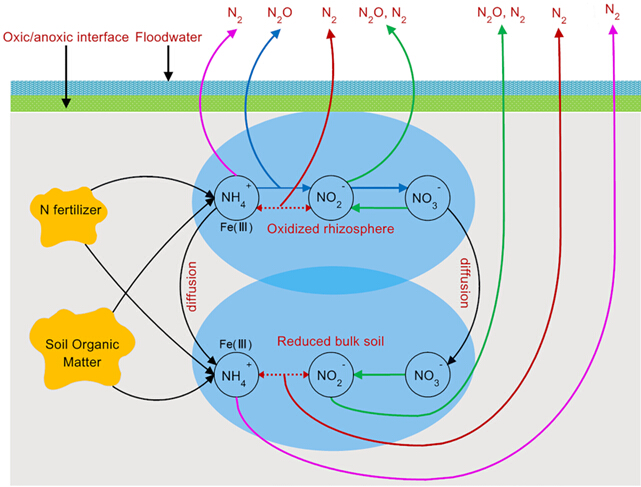 该研究指出,造成湿地植物根际区厌氧氨氧化“热区”的原因可能是湿地植物根系具有特殊的“泌氧”功能。硝酸盐是厌氧氨氧化发生的重要限制因素,湿地植物根际区硝化和反硝化均为厌氧氨氧化提供硝酸盐;而在厌氧的非根际区,硝化作用受到抑制,只有反硝化为其提供硝酸盐。此外,相比非根际区,由于“氧”的存在,根际区的反硝化活性也迅速降低了。朱永官课题组预测,湿地生态系统(如稻田)土壤厌氧氨氧化是根际驱动(rhizosphere-driven)的微生物学过程,并提出根际氮损失的概念模型。