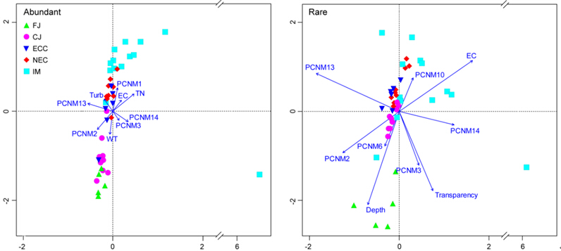 中国科学院城市环境研究所水生态健康研究组杨军团队利用高通量测序技术和现代多元统计分析方法,对我国东部5个区域42个湖库的优势和稀有浮游细菌的群落生态和生物地理分布进行了研究,取得以下研究结果:1)稀有和优势细菌群落的生物地理分布格局大致相似,都呈现显著的距离递减规律;表明稀有细菌的分布并不是随机的,可能受到与优势细菌相似的历史和生态过程的影响。2)稀有和优势细菌地理分布存在一些不同特征,例如稀有细菌群落呈现出更强的距离递减关系,细菌丰度和分布范围显著正相关;说明与优势细菌相比,稀有细菌的地理分布更受限制。3)影响稀有和优势细菌空间分布的环境和地理因子不同,例如稀有细菌与水深显著相关,优势细菌与水温显著相关;稀有细菌主要受局域环境因子控制,优势细菌受区域地理因子影响更大;暗示稀有和优势细菌可能具有不同生态位,在生态系统中发挥不同的作用。