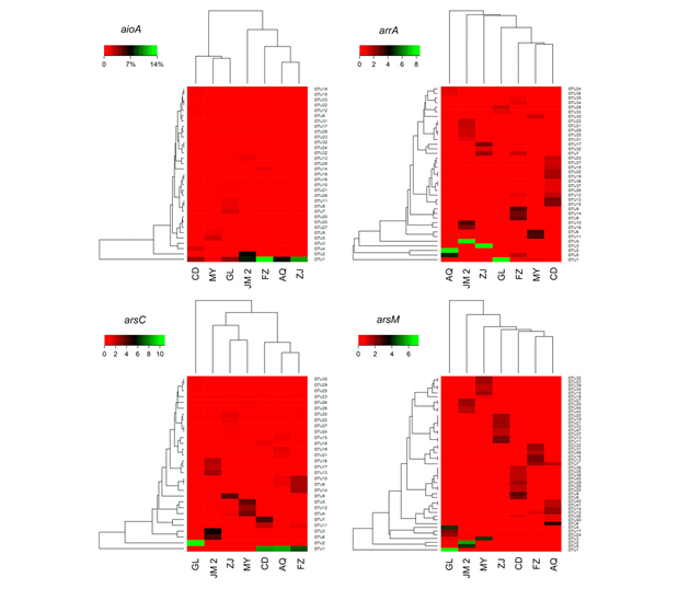 中国南方水稻土中aioA, arrA, arsC, 和 arsM基因热图