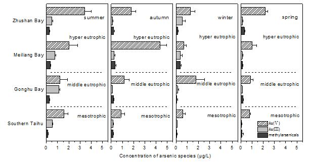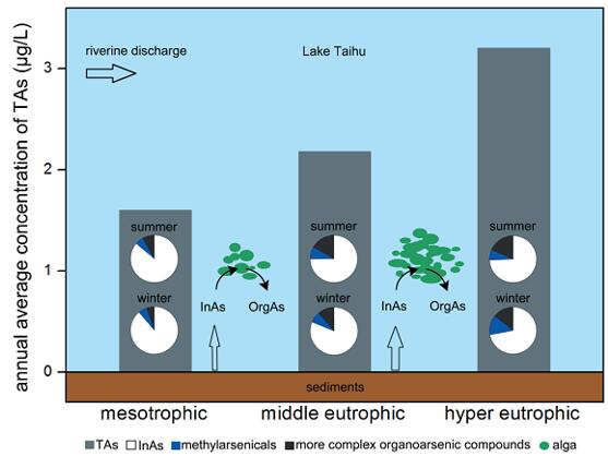 中国科学院城市环境研究所城市水环境与水生态研究组(颜昌宙团队)自2012年起在太湖流域按人类活动强度梯度选取不同富营养化水域(南太湖、贡湖湾、梅梁湾与竺山湾)建立长期定位生态环境观测站,重点对水和沉积相中砷形态的空间分布与季节变化、相关水体理化参数等开展了系统研究。通过多年数据分析表明,夏、秋季重度富营养化水域中总砷和五价砷的含量相对较高,其分布明显受到总磷、铁、锰和溶解性有机碳(DOC)的影响;夏季重度和中度富营养化水域的三价砷和甲基砷(MMA(V)+ DMA(V))含量和占比(占总砷的比例)均明显高于中营养水域。进一步的分析发现,富营养化环境引起磷、叶绿素a、铁、锰和有机碳等主要水质参数的变化,有利于水生态系统中砷的生物地球化学循环。由于我国许多地区不仅面临重金属和砷污染问题,同时还承受着水体富营养化的困扰,因此本研究结果对于深入认识富营养化湖泊环境中砷的环境地球化学行为,预测其生态风险,保障湖泊生态系统健康和饮用水源安全, 具有十分重要的意义。