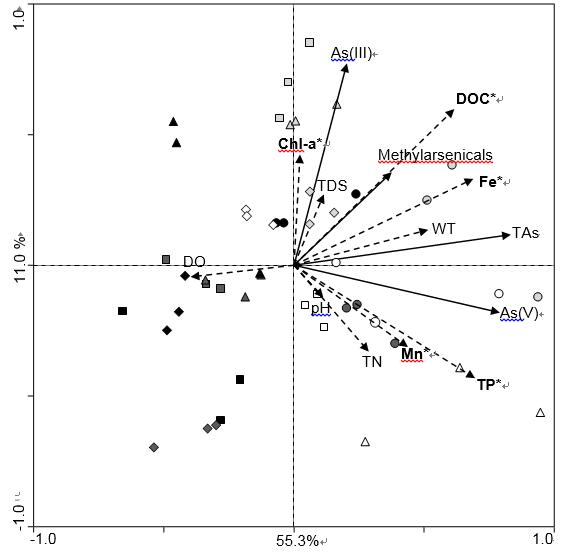 砷(As)在天然水体中多以砷酸盐[As(V)]、亚砷酸盐[As(III)]等无机形态和一甲基砷(MMA)、二甲基砷(DMA)等有机形态存在,因其不同的生物毒性效应与环境健康风险而引起世界范围内的广泛关注。尽管已有的研究表明砷在天然水体中的迁移与转化可能受到水体富营养化的影响,但是缺乏较为系统的研究,特别是基于长期的定位试验观测和多元统计分析的环境影响因素研究仍然十分缺乏和滞后。