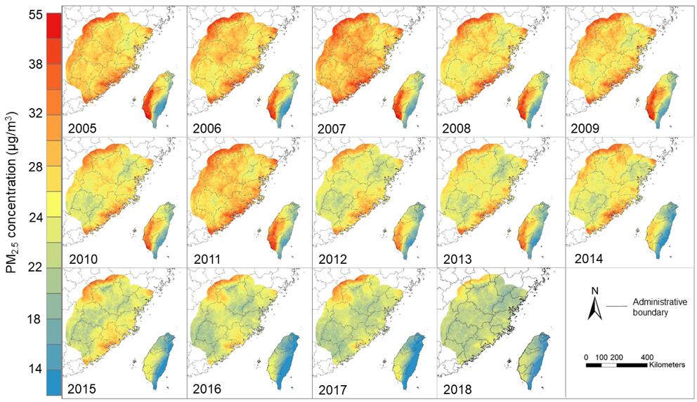 本研究中,我们利用了Terra和Aqua卫星的多项数据,结合机器学习算法,建立了闽台两岸2005-2018年分辨率为1公里的时空连续PM2.5月均浓度数据集,为分析PM2.5浓度空间分布变化提供数据支撑。由于卫星气溶胶数据存在非随机缺失引起的时空分布误差,建模过程中采用随机森林算法对缺失的卫星数据进行填补,进而得到时空连续的PM2.5浓度分布。利用高分辨率的PM2.5预测数据作为因变量,研究分别建立了针对闽台两岸总体和不同土地利用类型的多元线性回归政策有效性评价模型。该模型综合考虑了气候变化、土地利用及社会经济等因素导致PM2.5浓度变化的年际潜在影响。研究分析了闽台两岸大气污染防治政策分别对推动PM2.5浓度下降的不同影响,评估最有效政策。