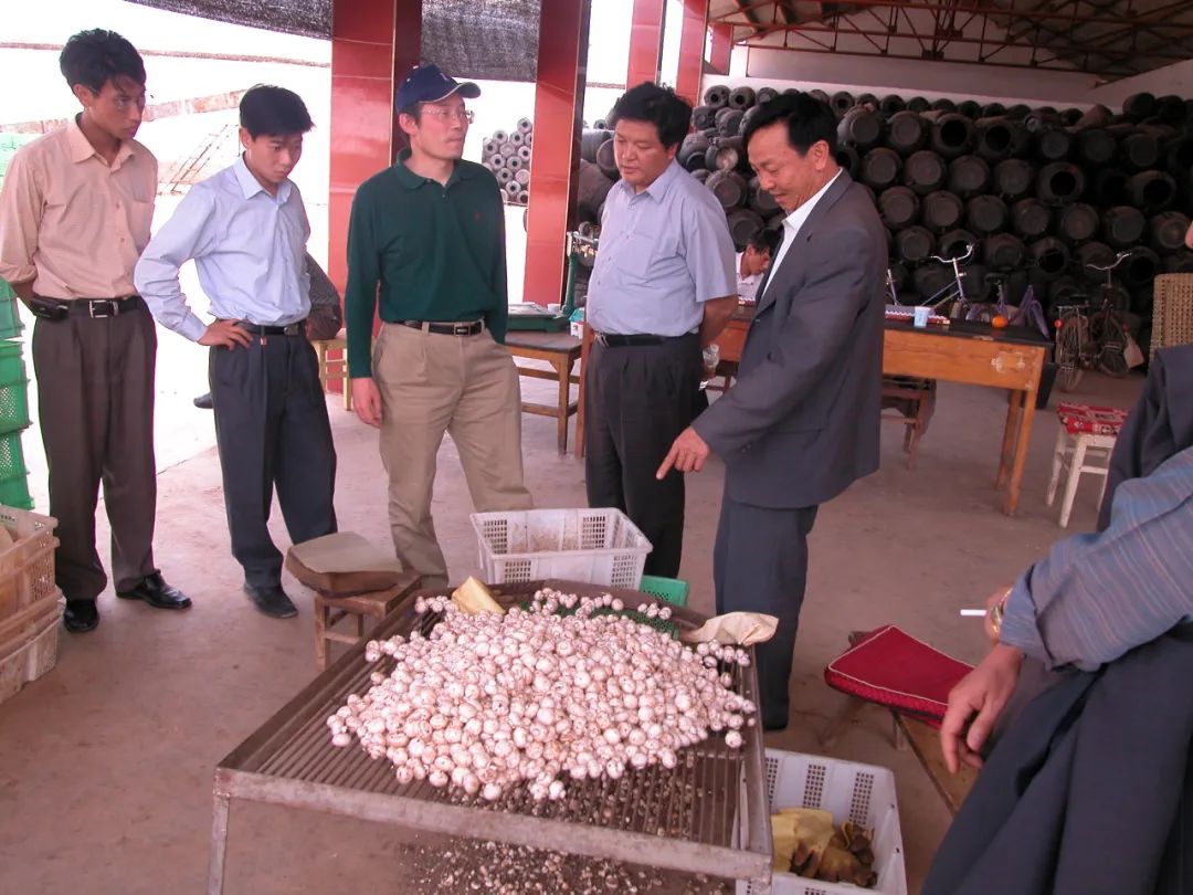 2005年,赵景柱同志在永胜县三川坝参观平菇种植合作社,了解农民参加种植业,增加收入的情况。(和瀚 供图)