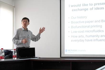 Wei 副教授做了题为“Low-cost Microfluidics and Diagnostic Assay Research”的学术报告,介绍了自己在生物活性纸张及丝线,低成本诊断试剂,功能性印刷等方面的研究成果,同时也和在场的同学和老师分享了自己如何从生活中发掘科研的灵感,如何开心做科研的体会。