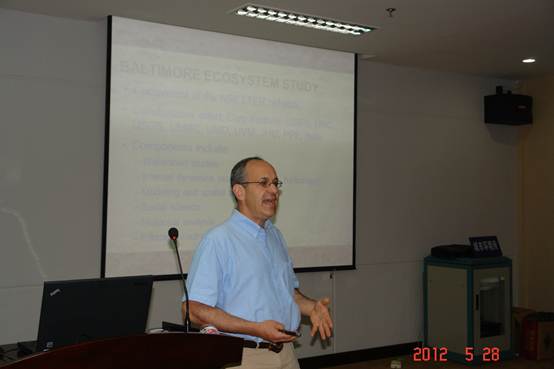 随后,Groffman向研究所科研人员和研究生做了题为“Sources and sinks of nitrogen in urban watersheds”的学术报告。报告以美国巴尔的摩长期城市生态系统生态研究站为例,从小流域尺度探讨了城市、农业和自然生态系统对自然水体氮的输入及其循环生物化学过程。Groffman首先介绍了其团队在巴尔的摩长期生态站自1998年以来15年间监测和研究结果,并介绍了基于N-O稳定性同位素的氮输入溯源技术、河流反硝化作用脱氮的15N Push-Pull技术、基于反硝化酶活性(DEA)的潜在反硝化强度分析技术等。报告后,Groffman和相关领域的科研人员展开了深入交流。Groffman博士将和俞慎研究团队展开“中美城市流域氮循环比较研究”项目合作。